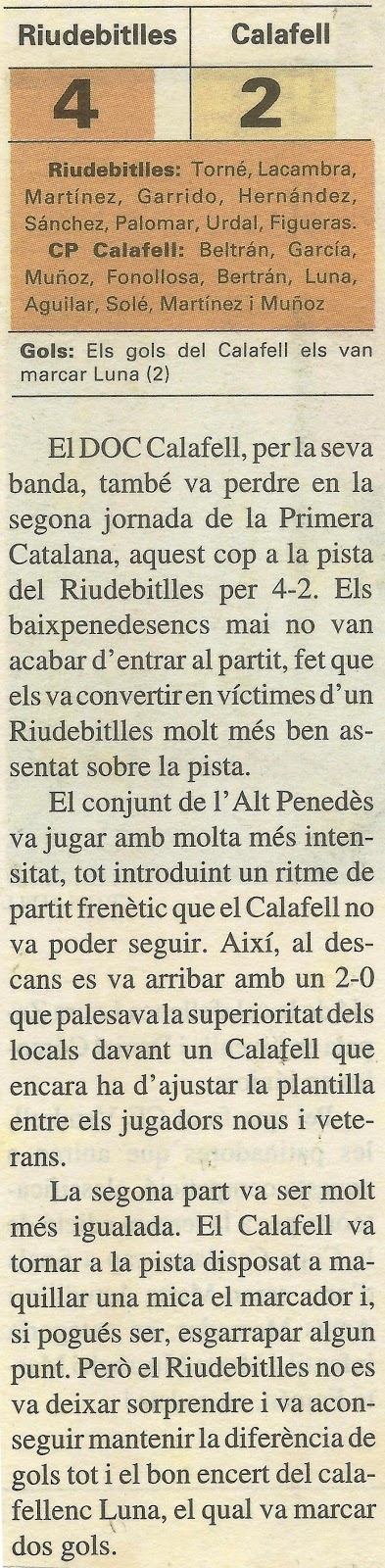 El segon partit, també, va acabar en derrota (4-2), a la pista del Riudebitlles. Javi Luna va fer els dos gols visitants. L'equip no acabava de trobar el joc adequat i perdia, al descans, per 2 a 0.